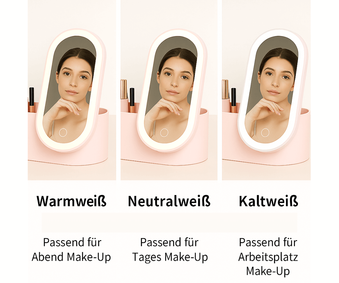 Das perfekte Licht für jeden Make-up-Look Egal ob natürliches Tages-Make-up, glamouröser Abend-Look oder präzises Styling fürs Büro – mit den drei Lichtmodi wählst du jederzeit die passende Beleuchtung. Warmweiß für sanfte Eleganz, Neutralweiß für Alltag und Kaltweiß für maximale Klarheit – so gelingt dein Make-up bei jedem Licht perfekt.