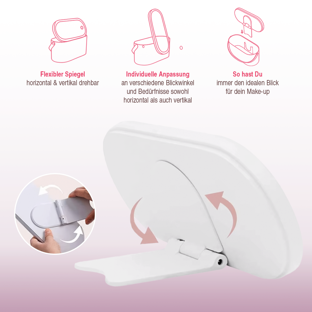 Der drehbare Spiegel lässt sich vertikal und horizontal ausrichten oder ganz abnehmen – perfekt für jedes Styling. Mit dem Griff wird die Box zur handlichen Tragetasche, ideal für unterwegs. Innen ist genug Platz für dein Make-up – ordentlich, kompakt, elegant.